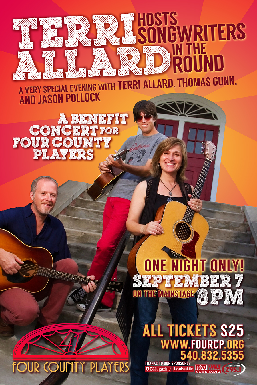 Renowned singer-songwriter Terri Allard returns to the Four County Players stage, joined by fellow singer-songwriters Thomas Gunn and Jason Pollock for a very special evening of songs, stories, and memories! This Fundraiser for Four County Players is ONE NIGHT ONLY, so make sure you don't miss it!